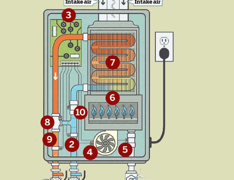 Tankless water heaters heat water instantaneously without the use of a storage tank. When a hot water faucet is turned on, cold water flows through a heat exchanger in the unit, and either a natural gas burner or an electric element heats the water. As a result, tankless water heaters deliver a constant supply of hot water. You don’t need to wait for a storage tank to fill up with enough hot water. However, a tankless water heater’s output limits the flow rate.
